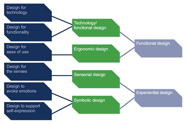 - Experiential design – these types related to the design impact on the end consumer such as sensorial design, which focuses on how the design evokes user emotions, as well as the design type that supported self-expressions. Both types are related to the concept of empathic design.